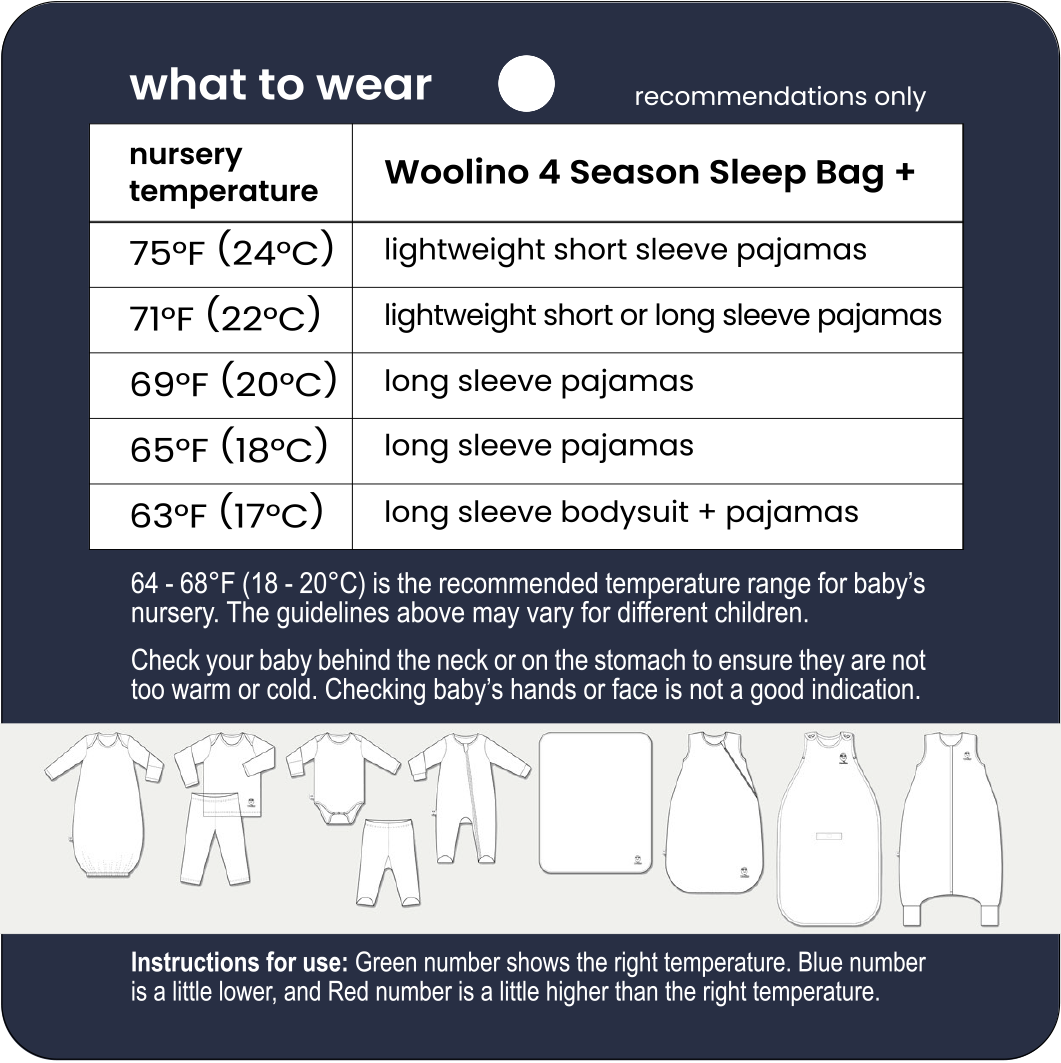 Our 4 Season baby sleeping bags work best in room temperatures between 63-77°F (17-25°C).